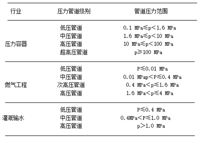 目前,管道的分類主要有兩種方法:按照材質(zhì)和壓力分類,其中按照材質(zhì)分類是管道主要的分類方法。管道按照是否加壓分為無(wú)壓管道和壓力管道。壓力管道是輸送的液體氣體等介質(zhì)在加壓的狀態(tài)下運(yùn)行的管道的統(tǒng)稱,一般以大氣壓力表示,根據(jù)工作壓力不同,可分為低壓、中壓和高壓等不同壓力等級(jí)的管道。分類標(biāo)準(zhǔn)與相應(yīng)行業(yè)的管道設(shè)計(jì)壓力范圍有關(guān)。在灌溉中涉及壓力管道的灌溉形式主要有低壓管道輸水灌溉、噴灌、微灌等??紤]到管道的設(shè)計(jì)壓力范圍,參照現(xiàn)有的塑料管道按照壓力分類的方法,按照管道公稱壓力可以分為:低壓管道(p0.4MPa)、中壓管道(0.4MPap1.0MPa)和高壓管道(p1.0MPa),具體見(jiàn)下表: