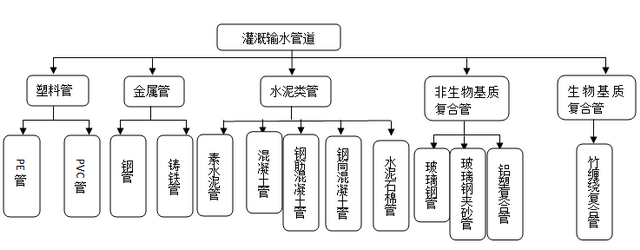 根據(jù)灌溉用管道材質(zhì)的不同,可以分為塑料管道、金屬管道、水泥類管道和復(fù)合管道??紤]管道基質(zhì)材料的重大不同,將復(fù)合管道分為非生物基質(zhì)復(fù)合管道和生物基質(zhì)復(fù)合管道。具體分類見(jiàn)下圖