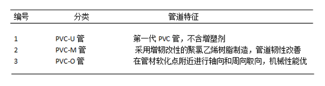 PVC管道以氯乙烯樹(shù)脂單位為主,加入必要的添加劑,用擠出成型法制成的熱塑性塑料圓管,具有一定的耐腐蝕性能,一般用于常溫介質(zhì)的管道。1936年德國(guó)開(kāi)始開(kāi)發(fā)使用PVC管材,我國(guó)從20世紀(jì)60年代引入PVC管道,最初主要用于化工領(lǐng)域,輸送帶腐蝕性的流體。根據(jù)其性能改進(jìn)情況,PVC管道分為PVC-U管道、PVC-M、管道PVC-O管道,其各自特點(diǎn)見(jiàn)下表。