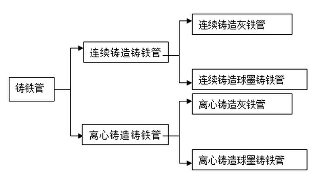 鑄鐵管道是用鐵水燒鑄的圓管的統(tǒng)稱。按管道成型工藝可分為連續(xù)鑄鐵管和離心鑄鐵管,按照鐵水的質(zhì)量可以分為連續(xù)鑄造灰鐵管、連續(xù)鑄造球墨鑄鐵管、離心鑄造灰鐵管和和離心鑄造球墨鑄鐵管,見(jiàn)下圖