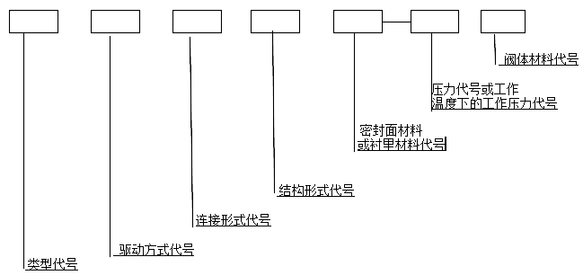 2. 編制的順序按:閥門類型、驅(qū)動方式、連接形式、結(jié)構(gòu)形式、密封面材料或襯里材料類型、公稱壓力 代號或工作溫度下的工作壓力代號、閥體材料。
